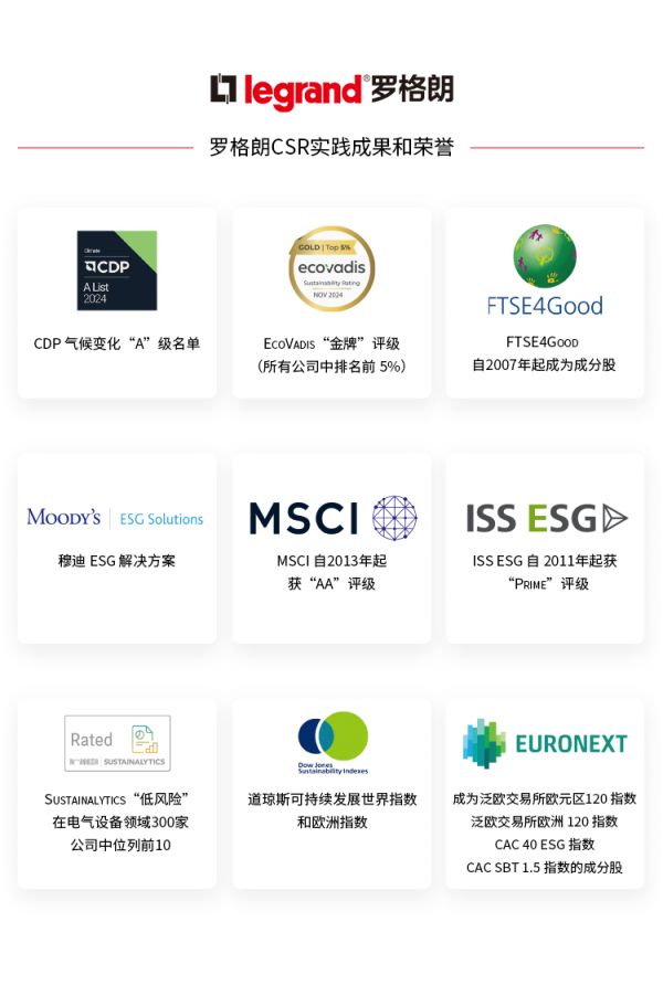 自2006年以来,罗格朗签署了联合国全球契约,承诺提供创新和可持续发展解决方案,提高能源效率,以减少对环境气候的影响。在过去的近20年里,罗格朗企业社会责任绩效在主要国际指数和ESG(环境、社会和治理)评级中得到认可和奖励,获得: