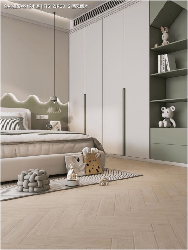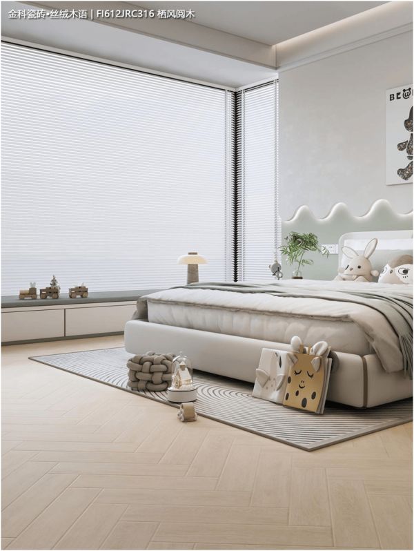 ▪️ 温馨感来自柔光:这款木纹砖拥有30°丝绒柔光质感,光线透过百叶帘洒下,在砖面上形成温柔光晕,为儿童房提供了恰到好处的温馨采光。