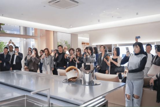 百能展厅内一套集成了智能科技的橱柜,该产品的台面可自动感应开启延伸,吸烟机与水龙头智能升降,水龙头更能自动旋转方向,精准定位出水点,引发了设计师们的浓厚兴趣与赞叹!