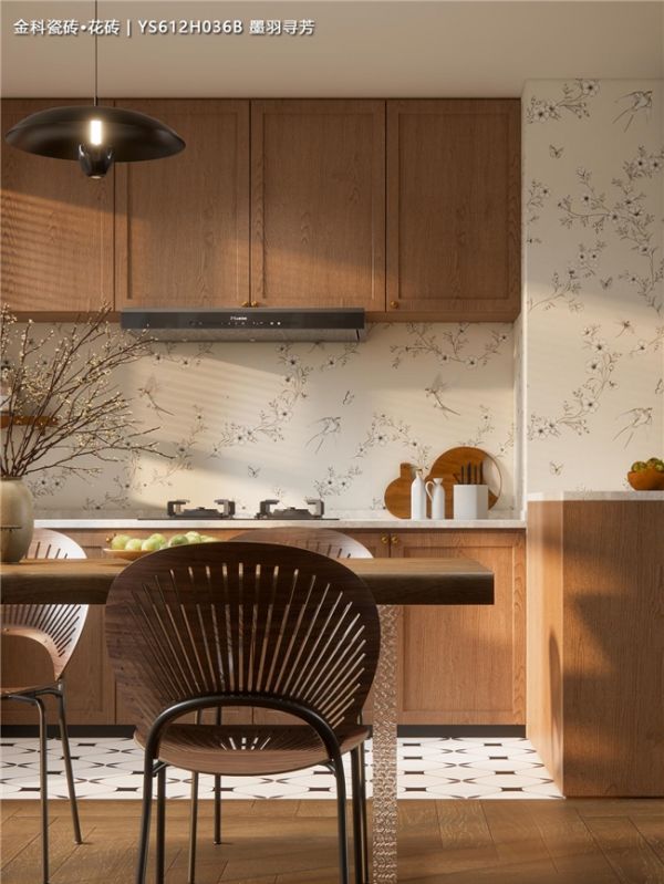 经典搭配:浅原木橱柜+花砖背景墙,温馨感瞬间拉满,怎么搭都不出错。