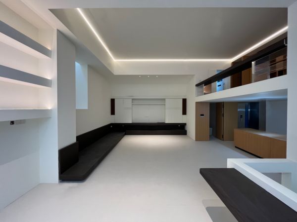 ▲客厅地面:魔术师岩板-极地白 / 地台地面:一品白