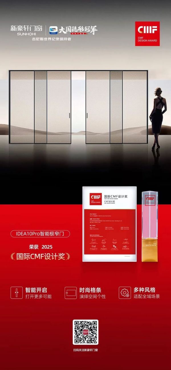 创新是产品设计的灵魂,作为国际设计潮流的风向标,国际CMF设计奖不仅考量美学表达,更强调创新价值与实用性能的深度融合。新豪轩IDEA10Pro智能极窄门斩获2025国际CMF设计奖,是国际设计界对中国智能门窗产品“颜值与实力并存”的高度肯定,也为行业树立了科技与艺术融合的美学示范。