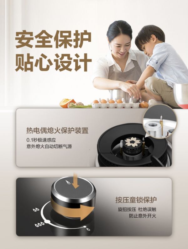 以安全守护,让每一次使用都安心无虞,樱花燃气灶S507GA采用按压式童锁保护装置,旋钮须先下压再旋转方能开启,用精密的结构设计守护每一个家庭的无忧舒适。热电偶熄火保护装置更以0.1秒的极速响应能力,在意外熄火的第一瞬间迅速切断气源,为烹饪空间筑起牢固的安全屏障。