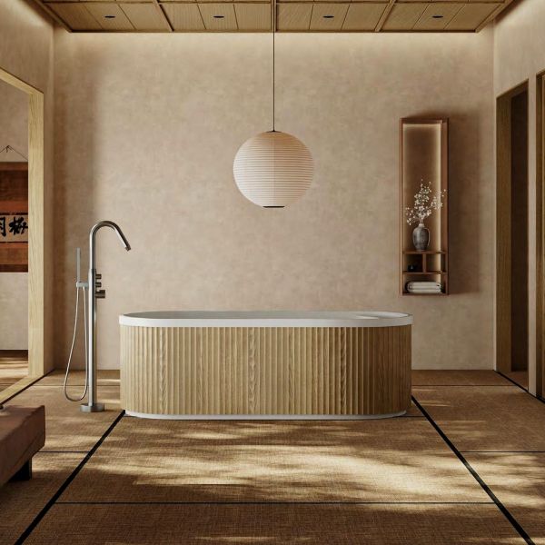 以纵向木纹围合亚克力浴缸缸体,木材的温润肌理与纯净缸体相融,静谧而克制。