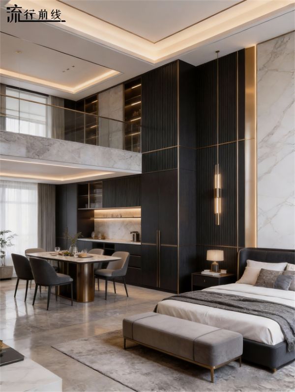 深灰与深棕色主导的色调,如墨色晕染,彰显出庄重与高贵,金色元素巧妙点缀于柜体边框与拉手之间,似星光落于肌理,成为空间的点睛之笔。