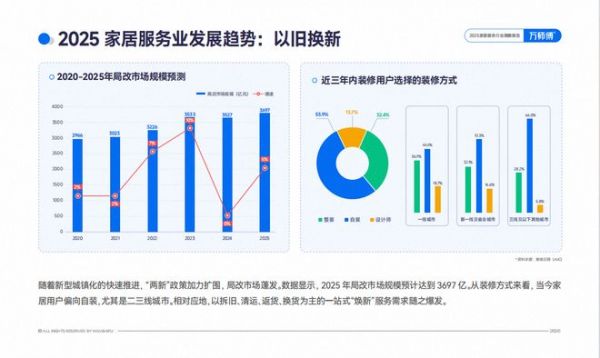在个性化需求的驱动下,局部改造市场蓬发。报告数据显示,2025年局改市场规模预计打到3697亿,超半数居民偏向自装。
