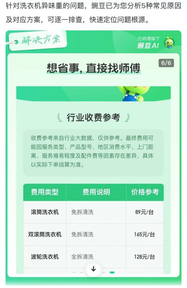 据了解,豌豆AI基于万师傅独家数据沉淀,聚合12年行业服务价格、超400万师傅资源和超2亿次订单训练自主研发生成。针对任何家电问题,豌豆AI都能给出对应诊断和解决办法,并拆解服务明细,提供行业价格指导。