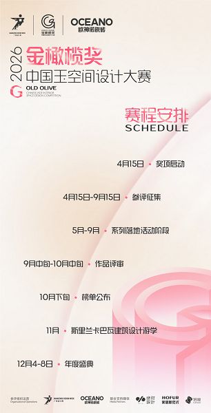 金橄榄奖·2026中国玉空间设计大赛以18.5万元奖金池、斯里兰卡巴瓦建筑研学、广州设计周与欧神诺双重品牌背书等为核心价值,全程免费参赛,旨在为广大设计师朋友提供切实的成长回报与权威曝光平台。即刻打开微信搜索“金橄榄设计力量”小程序,提交你的设计佳作,与行业共同缔造设计的无限可能!