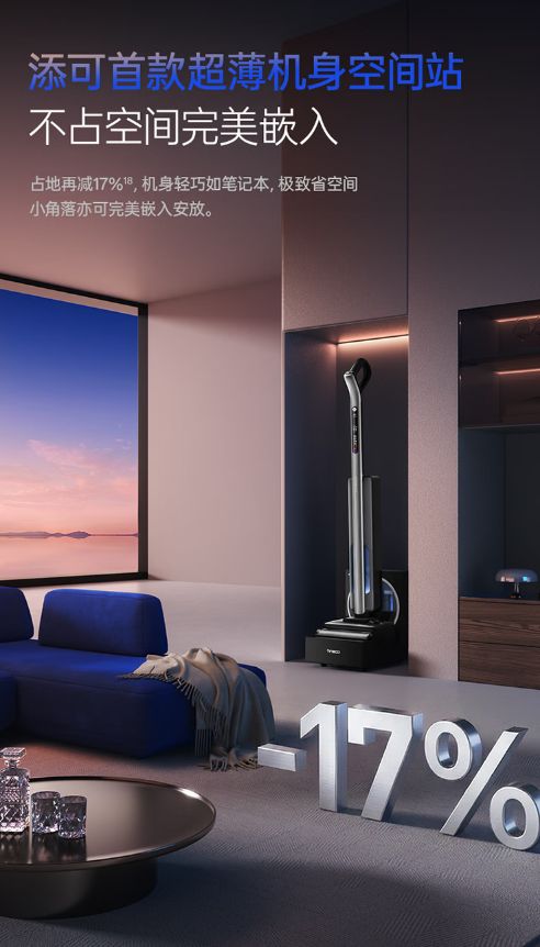 第三,超薄灵动机身与全场景安装,实现科技与家居的无缝融合。芙万Station View不仅技术领先,其工业设计同样登峰造极。其空间站基站作为添可史上最小最薄的设计,占地面积大幅缩减17%,可以轻松嵌入厨房、阳台、洗手台、浴室等各种狭小角落,真正做到了“安装不设限”。与之匹配的洗地机主机,机身厚度压缩至惊人的10.8cm,可实现180°完全躺平清洁,轻松探入沙发、床底等低矮空间,实现全屋清洁无死角。高达99.9%的权威认证洗净比*,配合25000Pa的澎湃吸力和前置多层捕获零缠毛系统,确保干湿垃圾、毛发一次吸净。通过对产品物理尺寸的优化,添可再次诠释了“隐序”美学理念,让强大的科技隐于无形,让便捷的生活显于日常。