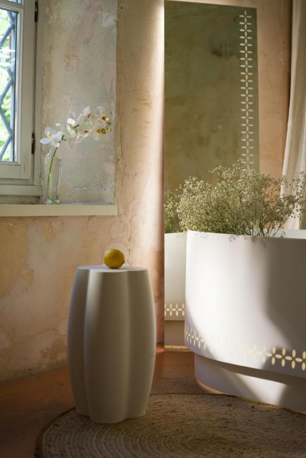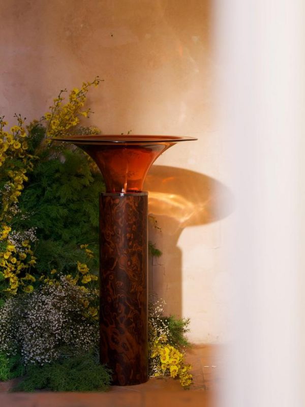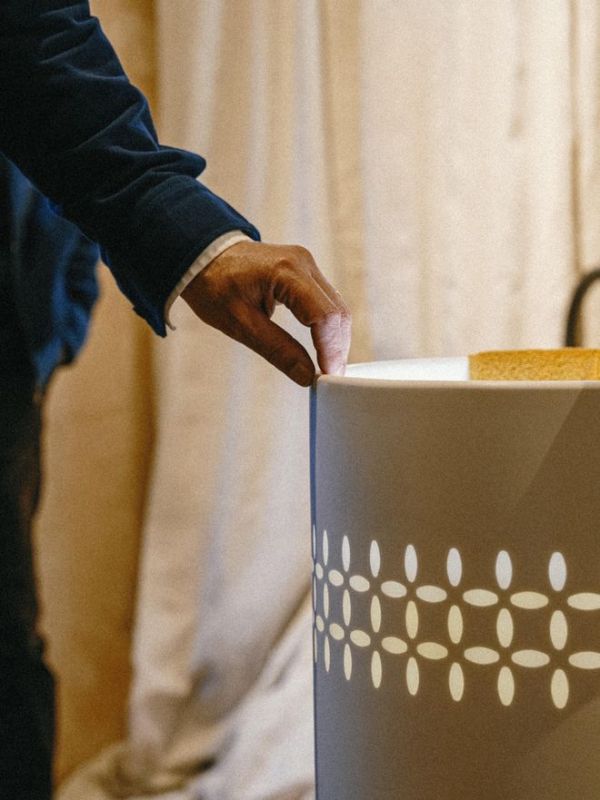 以千年陶瓷透雕工艺为根基,运用三维技法以人造石与与树脂材质结合在器物表面雕琢花叶状孔洞。光线穿过微雕孔洞时形成虚实相生的光影效果,兼具艺术装置属性与实用功能。