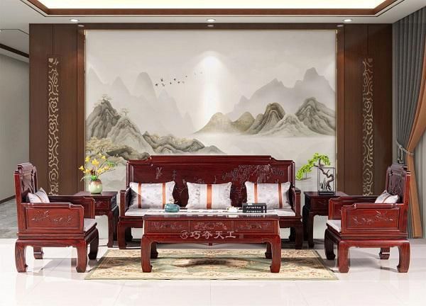 推开家门,最先迎接你的,该是这一室的融融春光。这款沙发,以微凹黄檀为材,雕刻张大千笔下的《春梅报喜图》。
