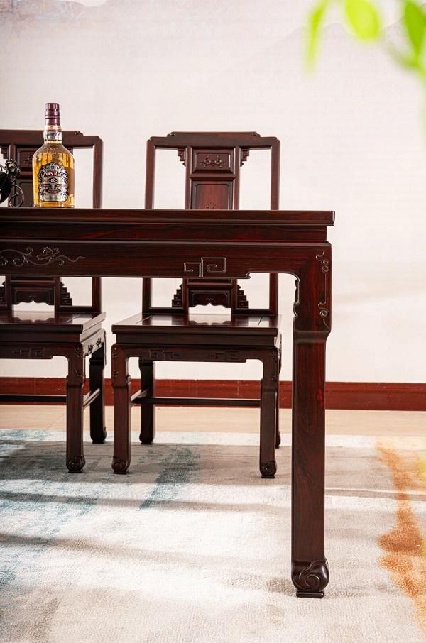 餐椅的设计更是别具匠心。后背呈阶梯状上升,线条清新秀雅。搭脑处的回字纹,与腿部的卷草纹遥相呼应,象征着福庆连绵,生生不息。当一家人围坐于此,碗筷碰撞间,是生活的烟火气;抬眼所及处,是永不凋零的春天。
